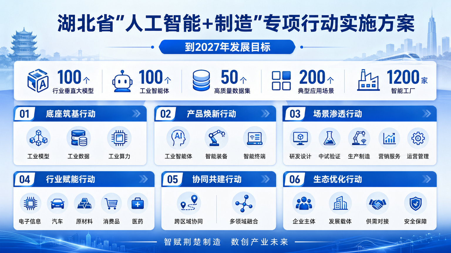 为深入贯彻党中央、国务院“人工智能+”行动战略,落实工信部等八部门《“人工智能+制造”专项行动实施意见》,协同推进智能产业化和产业智能化,促进人工智能与制造业深度融合、双向赋能,助力湖北加快建成中部地区崛起的重要战略支点,制定本实施方案。到2027年,建成100个达到国内先进水平的行业垂直大模型,推出100个以上高水平工业智能体,打造50个以上工业领域高质量数据集,发布200个以上“人工智能+制造”典型应用场景,培育1200家以上智能工厂,全省人工智能与制造业融合发展水平进入全国第一梯队。