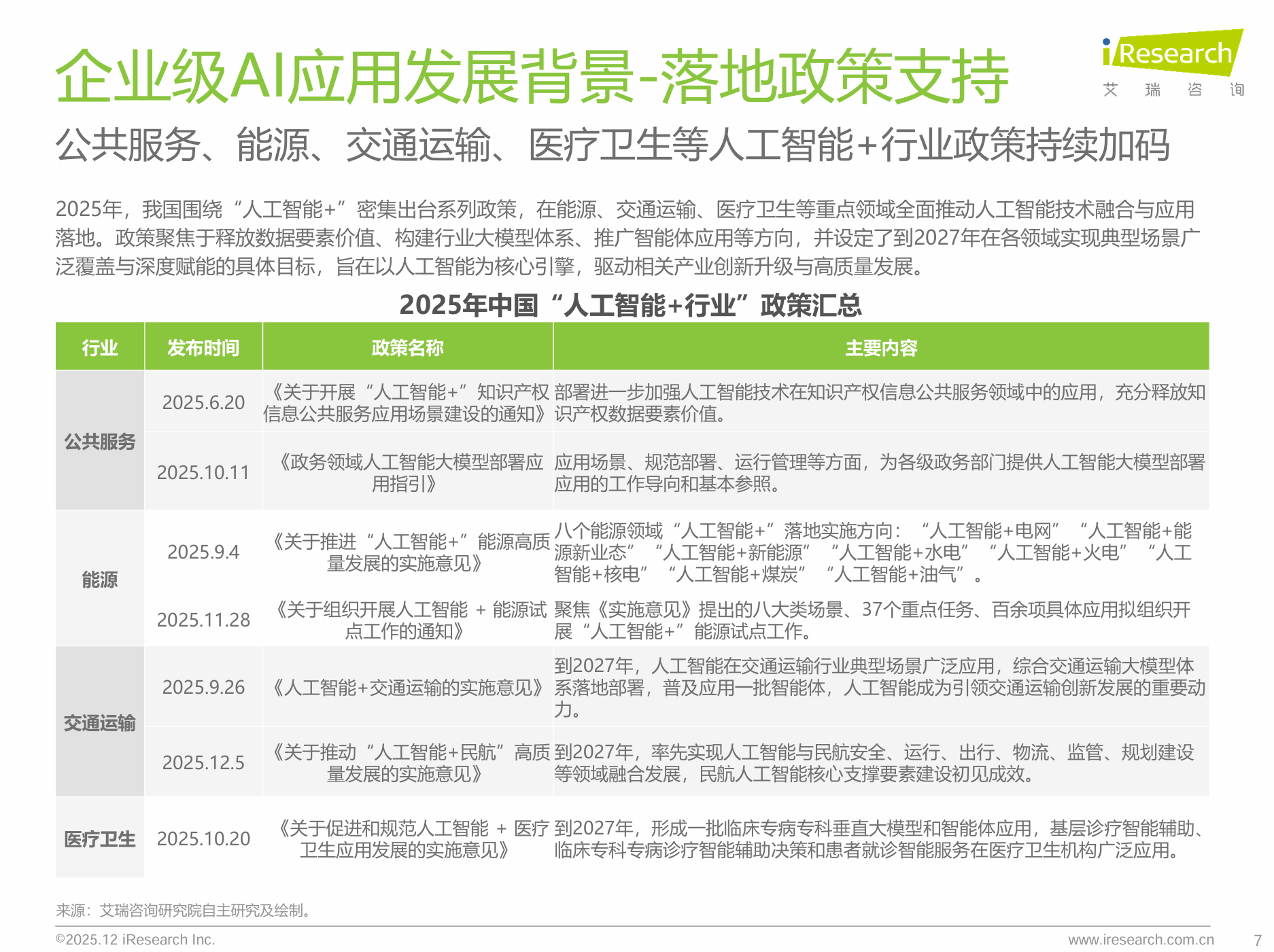 - 行业落地: 能源、交通、医疗、政务等垂直领域政策密集出台,从“单点突破”转向“全域赋能”。