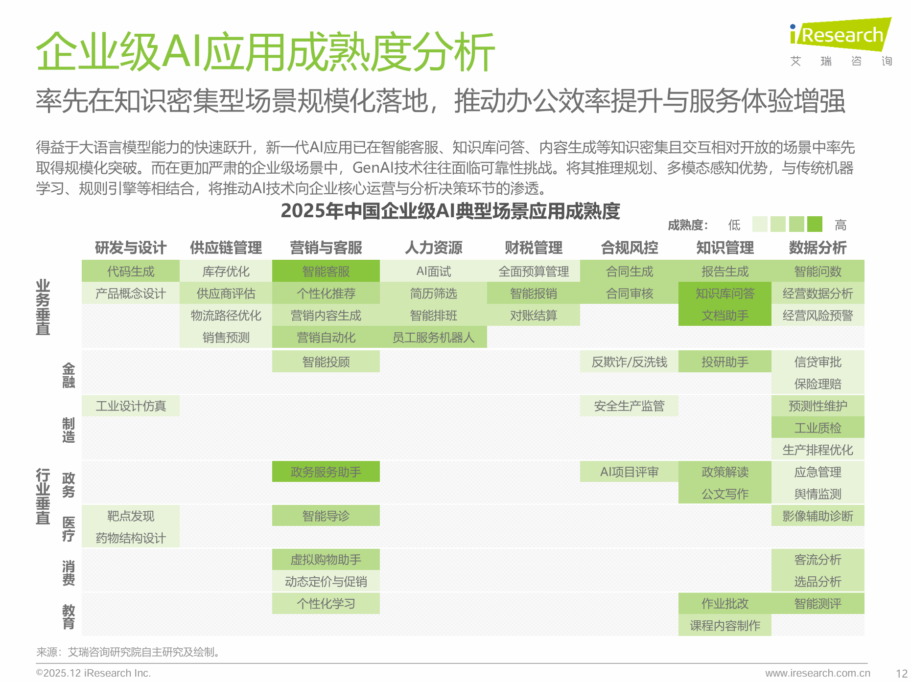 - 高成熟度: 智能客服、知识库问答、内容生成、代码辅助。